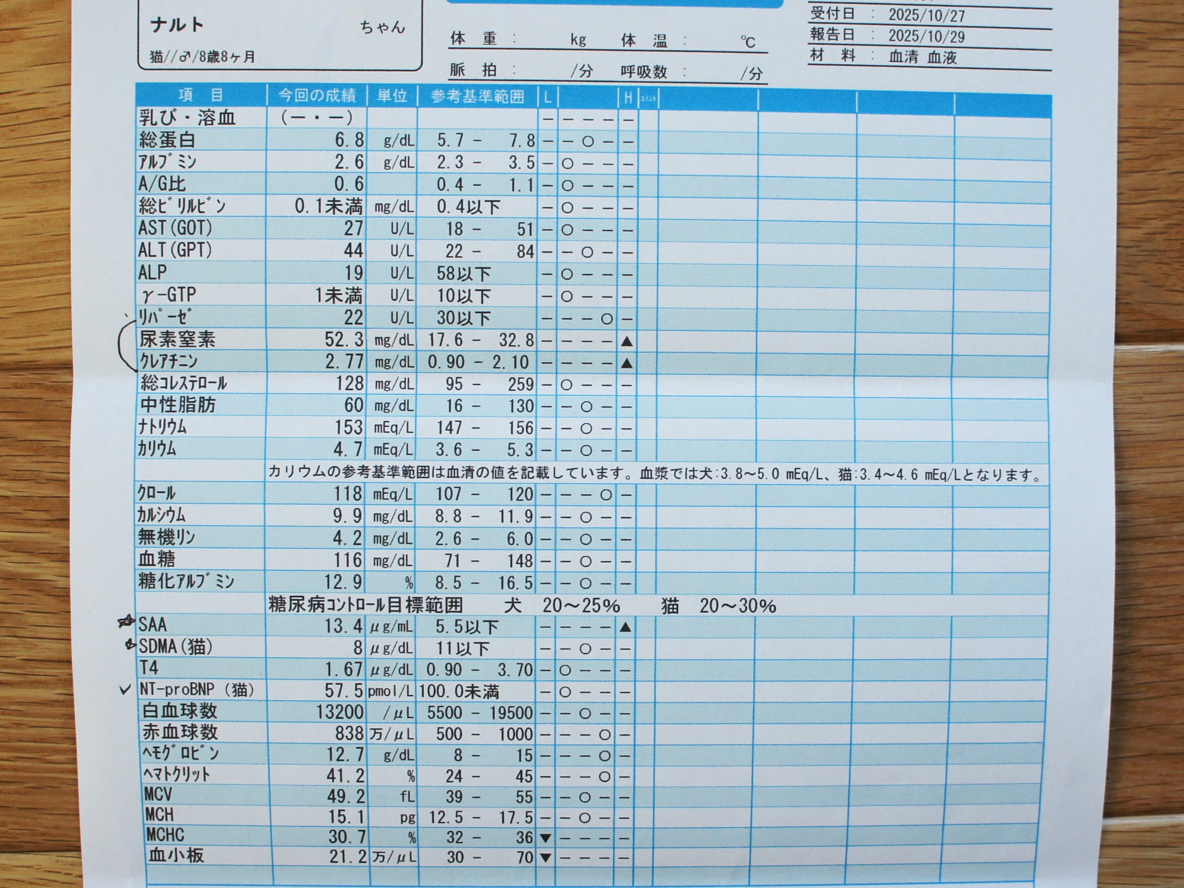 というのも、慢性腎臓病の異常が尿素窒素やクレアチニンより早期にわかる『SDMA』という数値が正常だったからなんですよね。