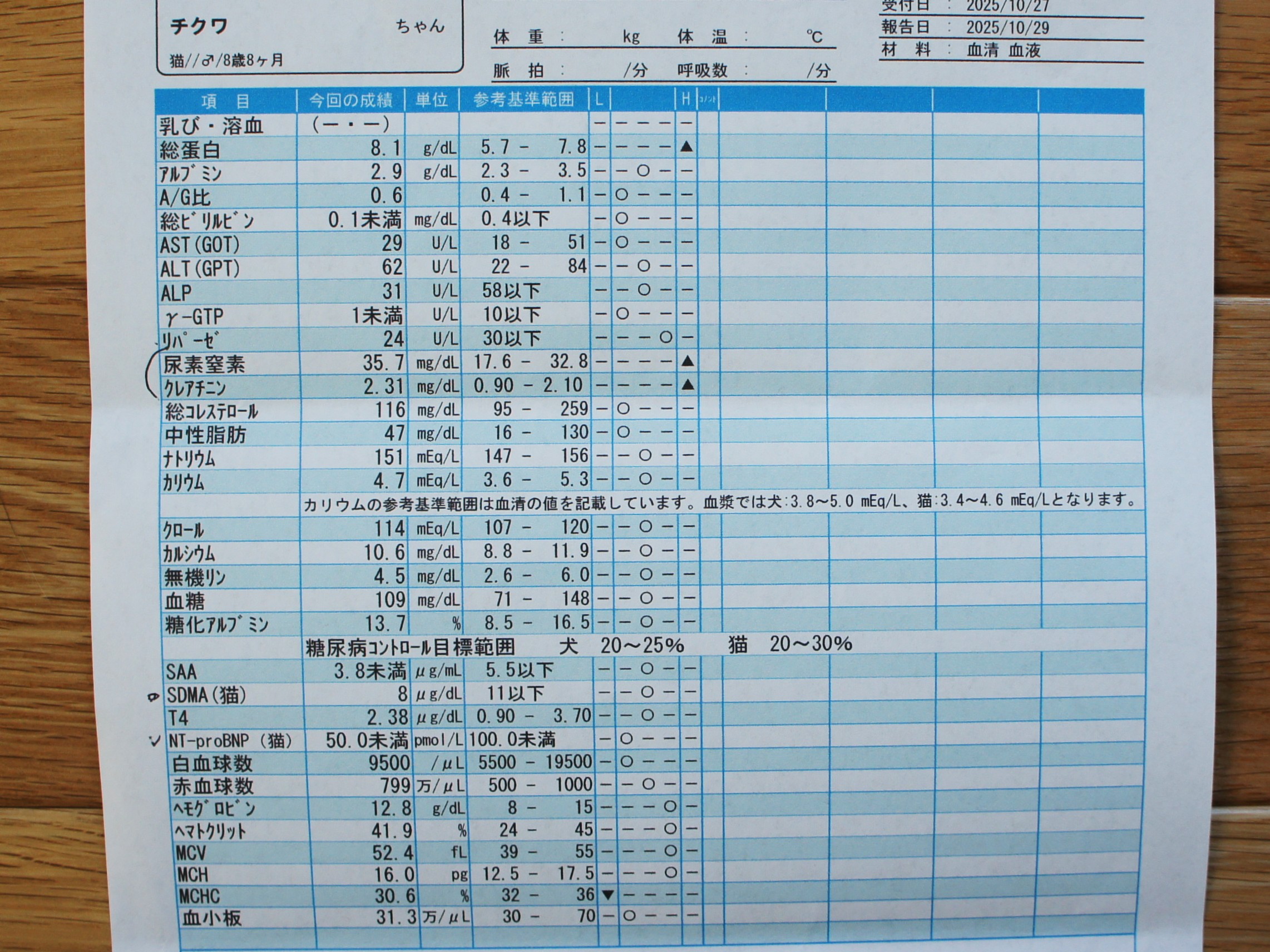 追加でお願いした心臓病マーカー『NT-proBNP』は異常なしで、そのほかも特に問題なく、予定通り手術を迎えました。