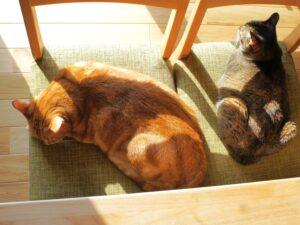 昼頃、なるとがごはんを欲しそうにしていたのでカリカリを出すと、なるとが食べる音を聞きつけて寝ていたちくわがやって来たんです。