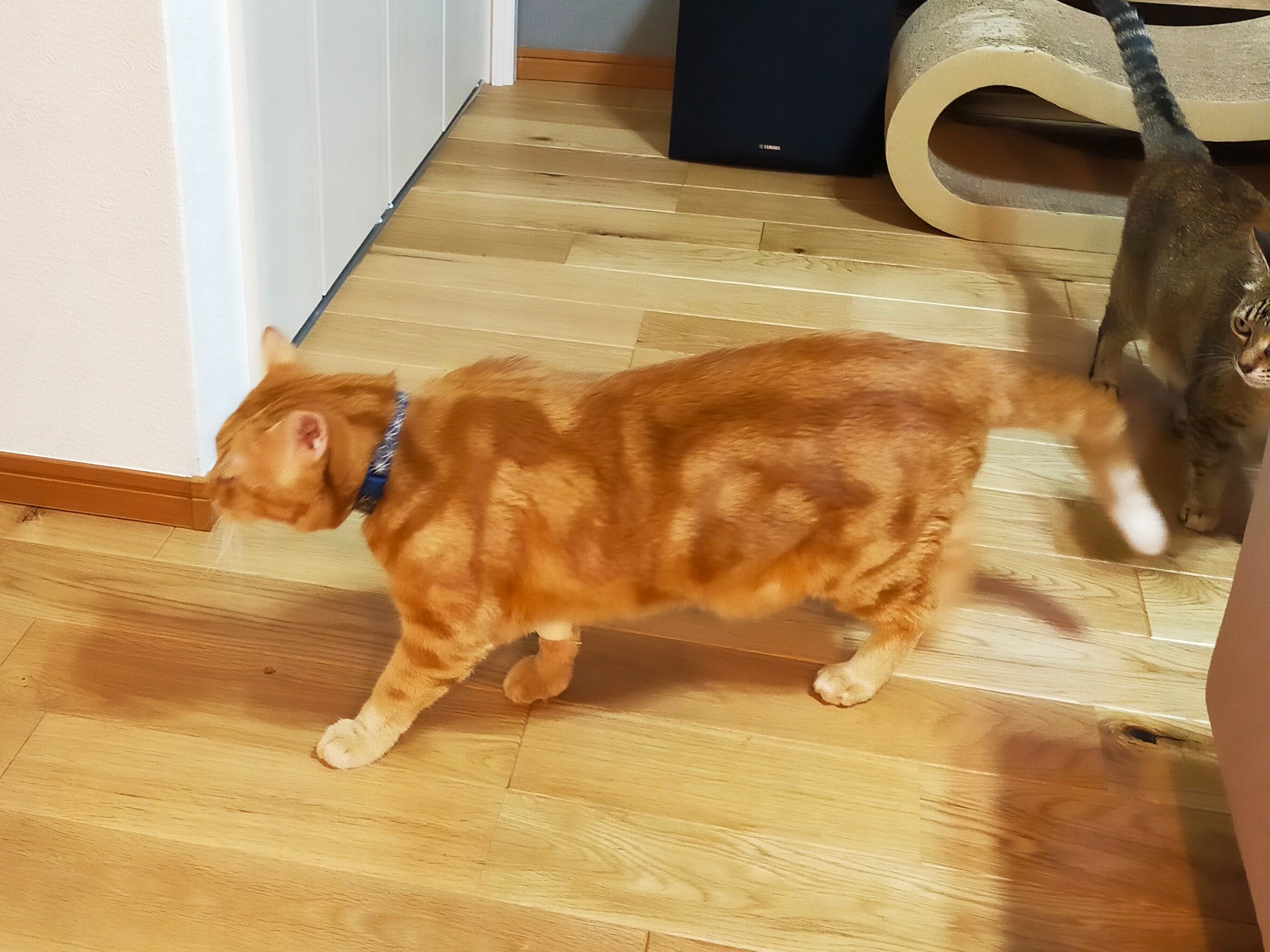 『チェストにオシッコ』は昨夜から2回ほど発動しているし、アビーを追いかけて怒られたり紐にじゃれついてみたり、もうすっかりいつも通り。