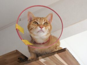 そういって着けていたぽぽねこさんのエリザベスカラーをグイッと引っ張ると、なるとの首から抜けてしまいました。