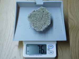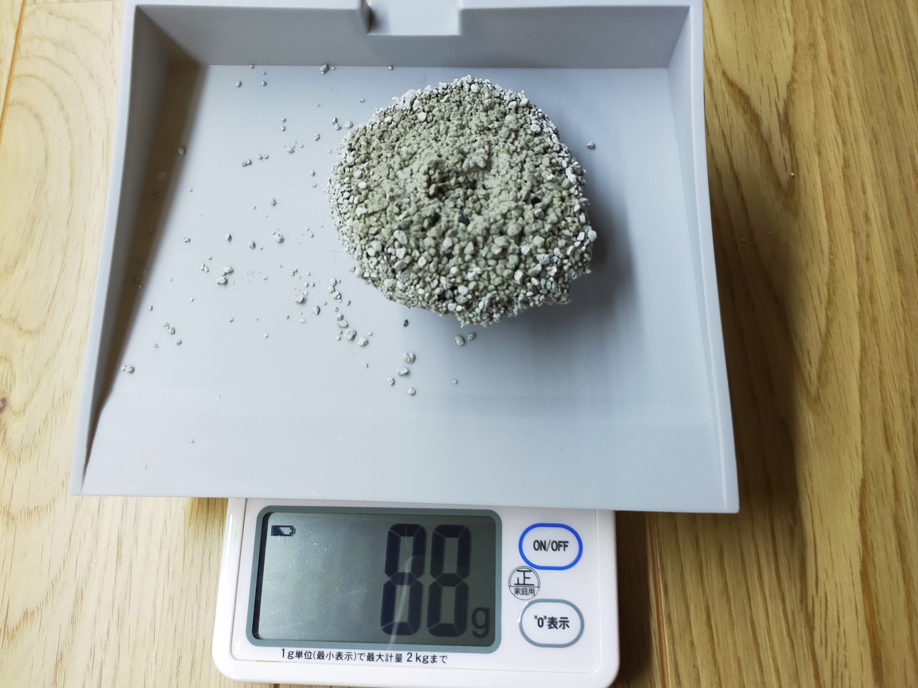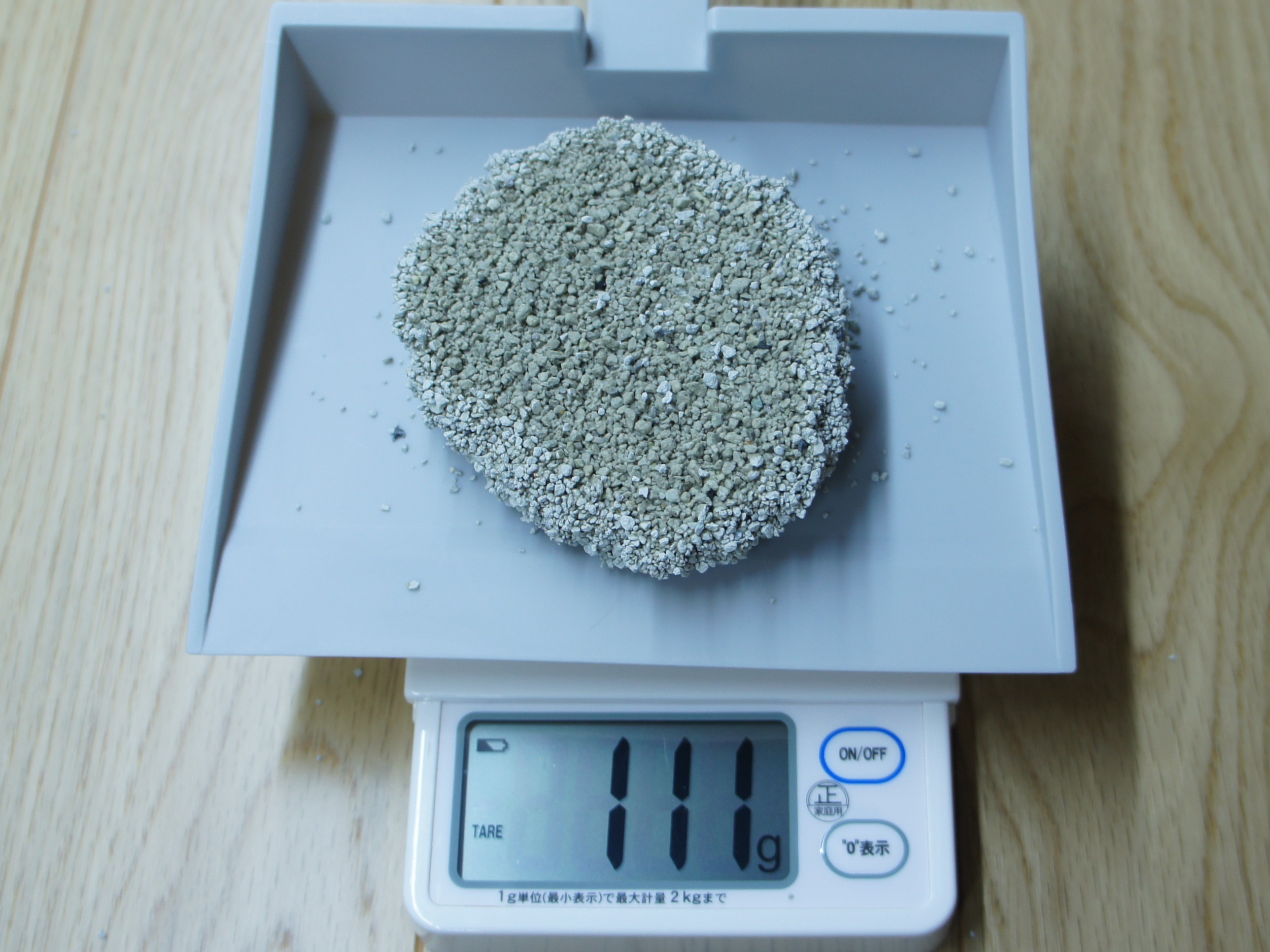 正確に量を測った水を猫砂に染み込ませ、水を含んだ塊の重さを測って検量線(塊の重さと含まれる水の量の関係を表すグラフ)を作ります。