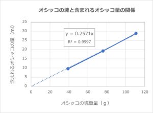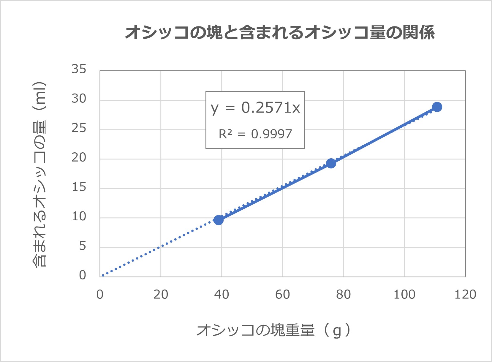 正確にはオシッコは水よりわずかに重いので、重さ(g)から量(ml)に変換するために猫のオシッコの平均比重(=1.04)を考慮に入れ、できた検量線がこちら。